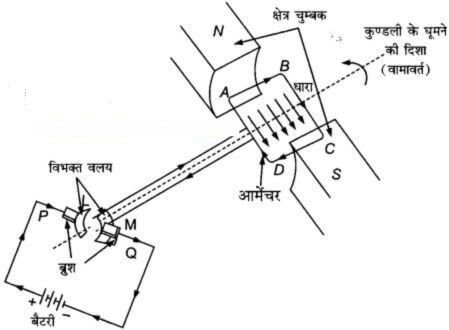 - जब आर्मेचर कुंडली में विद्युत धारा प्रवाहित होती है, तो फ्लेमिंग के बाएँ हाथ के नियम के अनुसार इसकी भुजाओं पर विपरीत दिशा में बल लगता है।