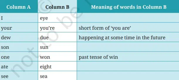 Note: The words given in each row of the table above have the same sounds but different spellings and meanings. Such words are called homophones.