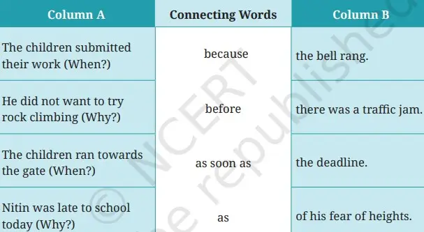 5. Match the phrases in Column A with the phrases in Column B. Use the connecting words given in the middle column to make meaningful Sentences.