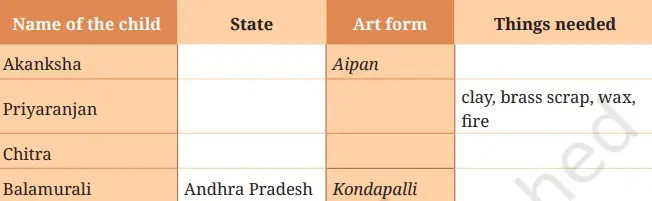 | Name of the child | State | Art form | Things needed |