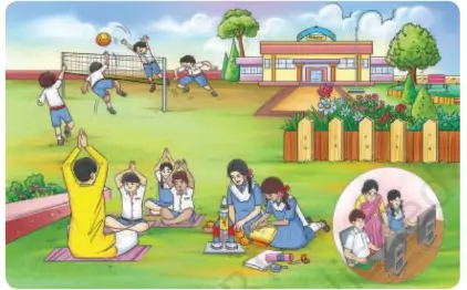 (9) विद्यालये विशालं क्रीडाक्षेत्रं अस्ति । (विद्यालय में बड़ा खेल मैदान है।)