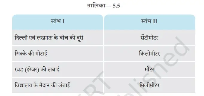 1. तालिका 5.5 के स्तंभ । में दी गई लंबाइयों का उनके मापन के लिए स्तंभ II में दिए गए मात्रकों में से उपयुक्त मात्रक से मिलान कीजिए।
