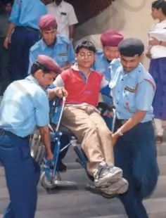 चित्र को देखिए और उस बच्चे के बारे में सोचिए, जिसे सीढ़ियों से नीचे लाया जा रहा है। क्या आपको लगता है कि इस स्थिति में उपर्युक्त कानून लागू किया जा रहा है? वह भवन में आसानी से आ-जा सके, उसके लिए क्या करना आवश्यक है? उसे उठाकर सीढ़ियों से उतारा जाना, उसके सम्मान और उसकी सुरक्षा को कैसे प्रभावित करता है?