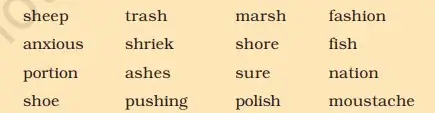3. Each of the following words contains the sound ‘sh’ (as in shine) in the beginning or in the middle or at the end. First speak out all the words clearly. Then arrange the words in three groups in the table on page 81.