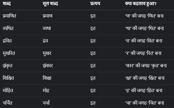 ‘इत’ प्रत्यय जोड़ने से शब्द का आखिरी हिस्सा बदलता है। यहाँ हर शब्द का मूल हिस्सा और बदलाव बताया गया है: