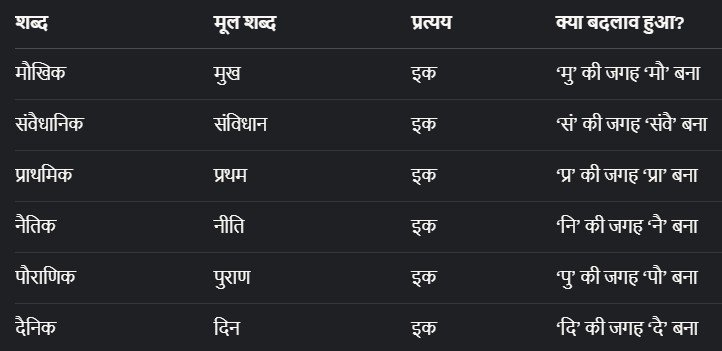 ‘इक’ प्रत्यय जोड़ने से शब्द का पहला हिस्सा बदलता है, जैसे ‘सप्ताह’ से ‘साप्ताहिक’। यहाँ मूल शब्द और बदलाव हैं:
