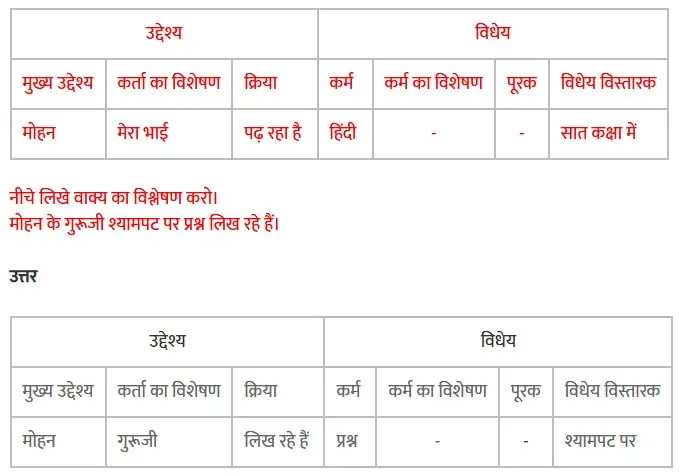 किसी भी वाक्य के दो अंग होते हैं – उद्देश्य और विधेय। वाक्य का विशलेषण करने में इन दोनों खंडों और अंगों को पहचानना होता है।