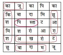 काबुलीवाला मेवे बेचता था। नीचे कुछ मेवों के नाम लिखें हैं। उन्हें दिए गए शब्दजाल में ढूँढो। ये संज्ञा हैं। इसकी विशेषता बताने वाले शब्द विशेषण होते हैं। उसे भी सोचकर लिखो।