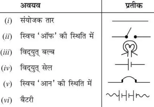 1. विद्युत परिपथों के निम्नलिखित अवयवों को निरूपित करने वाले प्रतीक अपनी नोटबुक पर खींचिए-संयोजक तार, स्विच ‘ऑफ’ की स्थिति में, विद्युत बल्ब, विद्युत सेल, स्विच ‘ऑन’ की स्थिति में तथा बैटरी।