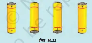 3. चित्र 10.22 में चार सेल दिखाए गए हैं। रेखाएँ खींचकर यह निर्दिष्ट कीजिए कि चार सेलों के टर्मिनलों को तारों द्वारा संयोजित करके आप बैटरी कैसे बनाएँगे?