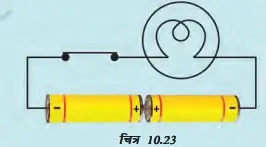 4. चित्र 10.23 में दर्शाए गए परिपथ में बल्ब दीप्त नहीं हो पा रहा है। क्या आप इसका कारण पता लगा सकते हैं? परिपथ में आवश्यक परिवर्तन करके बल्ब को प्रदीप्त कीजिए।
