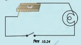 7. यदि चित्र 10.24 में दर्शाए गए विद्युत परिपथ में स्विच को ‘ऑफ’ किया जाए, तो क्या चुंबकीय सुई विक्षेप दर्शाएगी?