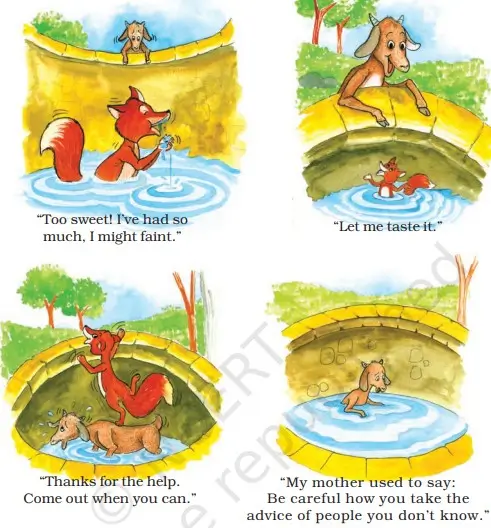 The foolish goat believed the fox and jumped into the well to taste the water. As soon as the goat was in the well, the fox climbed onto the goat’s back and jumped out. The fox thanked the goat and ran away, leaving the goat stuck in the well. The goat realized her mistake and remembered her mother’s warning: “Never trust a stranger!”
