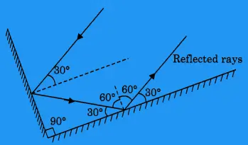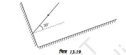 - 1.15 15. दो दर्पण एक-दूसरे के लंबवत् रखे हैं। प्रकाश की एक किरण एक दर्पण पर 30° के कोण पर आपतित होती है जैसा कि चित्र 13.19 में दर्शाया गया है। दूसरे दर्पण से परावर्तित होने वाली परावर्तित किरण बनाइए।