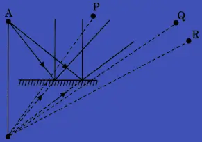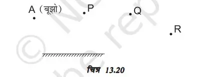 16. चित्र 13.20 में दर्शाए अनुसार बूझो एक समतल दर्पण के ठीक सामने पार्श्व से कुछ हटकर एक किनारे A पर खड़ा होता है। क्या वह स्वयं को दर्पण में देख सकता है? क्या वह P, Q तथा R पर स्थित वस्तुओं के प्रतिबिंब भी देख सकता है?