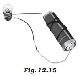 उत्तर:- नहीं, चित्र 12.15 में दिखाए गए परिपथ में बल्ब दीप्तिमान नहीं होगा। बल्ब के दोनों टर्मिनल से तार जुड़े होने चाहिए ताकि विद्युत धारा प्रवाहित हो सके। यहाँ, दोनों तार केवल एक टर्मिनल से जुड़े हैं, जिससे परिपथ अधूरा रहता है और बल्ब नहीं जलता।