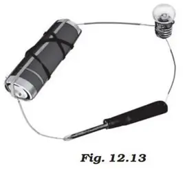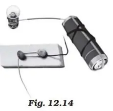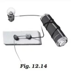 प्रश्न 6: चित्र 12.14 में सुरक्षा पिन की जगह अगर रबड़ लगा दें तो क्या बल्ब दीप्तिमान होगा?