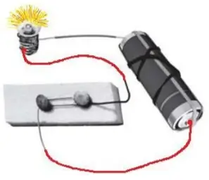 • तार का एक सिरा बैटरी के एक टर्मिनल से जुड़ा है और दूसरा सिरा बल्ब के एक टर्मिनल से। बल्ब के दूसरे टर्मिनल और बैटरी के दूसरे टर्मिनल के बीच कोई कनेक्शन नहीं है।
